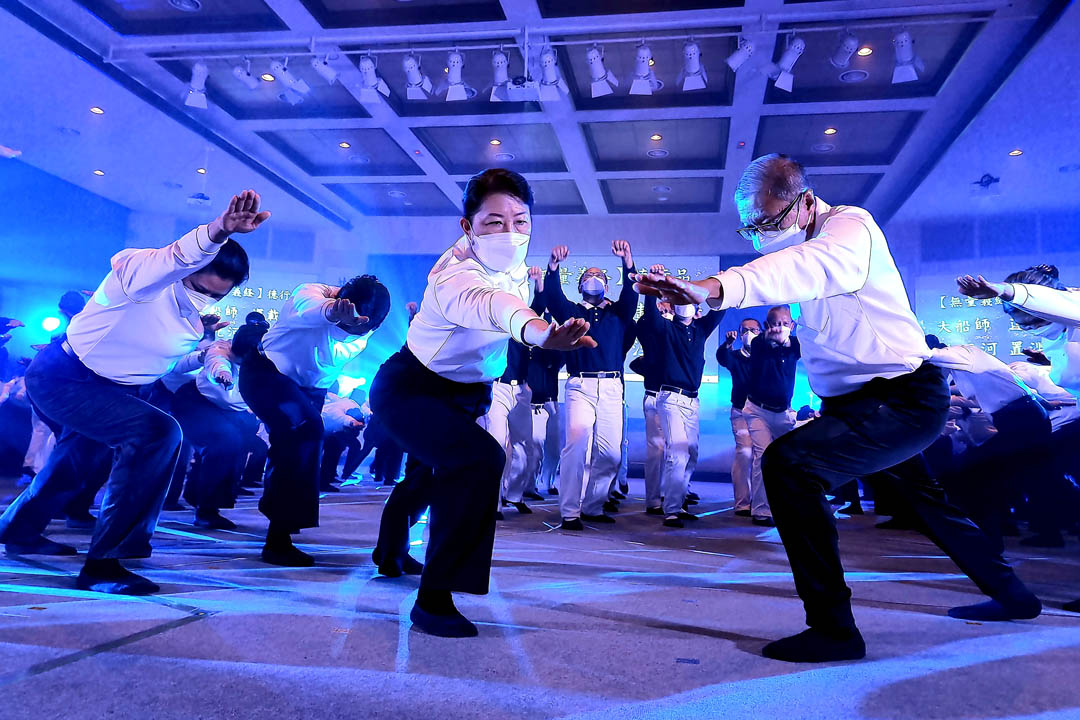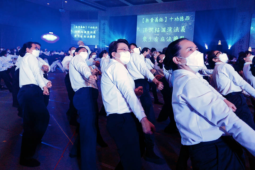 志工黄淑娟(慈务)和黄永伟(济瑞)承担演绎种子老师,负责教导志工大德肢体动作。黄淑娟分享,“接下重任,压力颇大。上人有说,如果不熟悉经文,就会将法会当作是演唱会。当想到〈德行品〉中有一句‘能舍一切诸难舍',再大的困难,我们都可以突破。感恩有永伟补我的不足。”