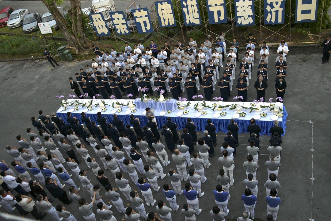 上午人潮虽不断,但大家依然井然有序地列队浴佛,随后即前往供斋区进餐,无吵杂与不安。环境虽稍微挤迫,但现场氛围温馨祥和。