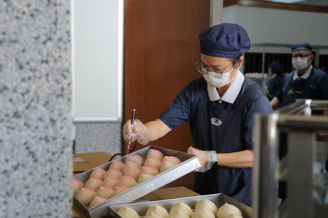 虽然在赶制中的厨房工作一片忙碌,却井然有序。志工们全程佩戴口罩,严格落实卫生规范,从揉面及包入馅料,到细心塑形与上色,每一道工序皆一丝不苟,将诚意与祝福融入其中。
