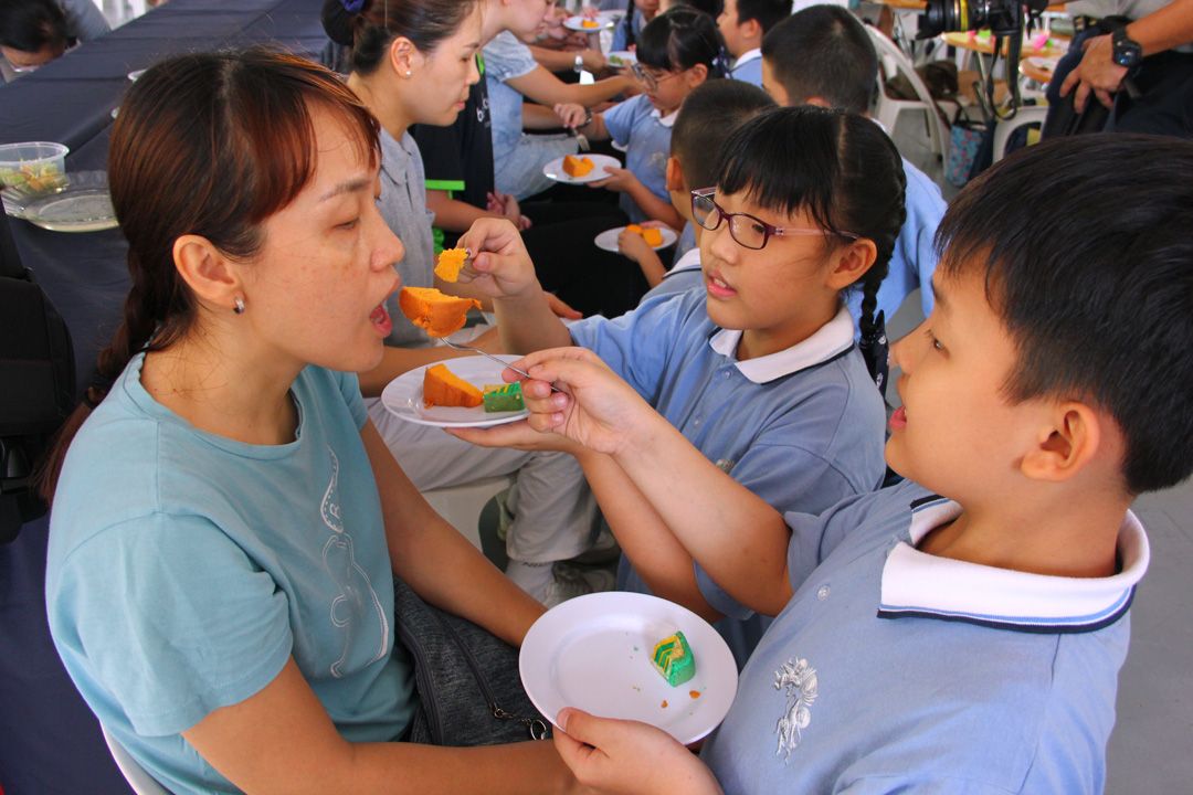 陈芊苡(中)及陈政弘(右)跪着喂妈妈陈莉娜吃蛋糕,场面温馨动容【摄影:庄茂兴】。