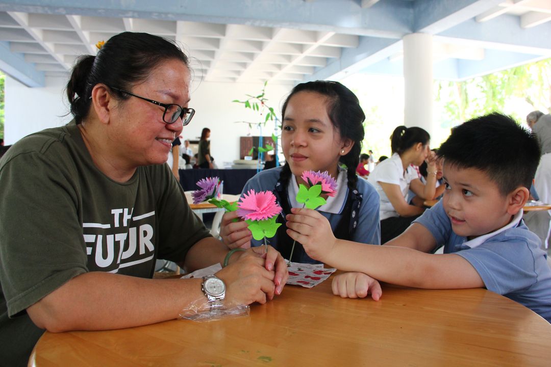 刘尊仁(右)及刘尊慈(中)将亲手制作的纸花送给妈妈魏似凤(左),感谢母亲的养育之恩【摄影:庄茂兴】。