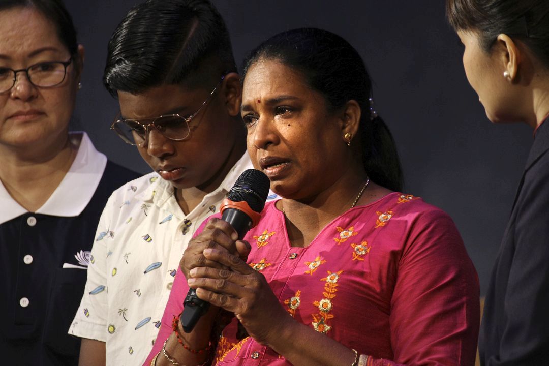 先生维佳雅(Vijaya)洗肾,阿慕妲一家因病而贫;志工上门关怀,除了金钱的补助、负责维佳雅每月到医院复诊的载送、慈济人医会医生的往诊等,让阿慕妲安下心来。站在台上的她哽咽道感恩:“当我有需要时,他们一直都在我身边,比亲人还要亲,所以我从不孤单。”