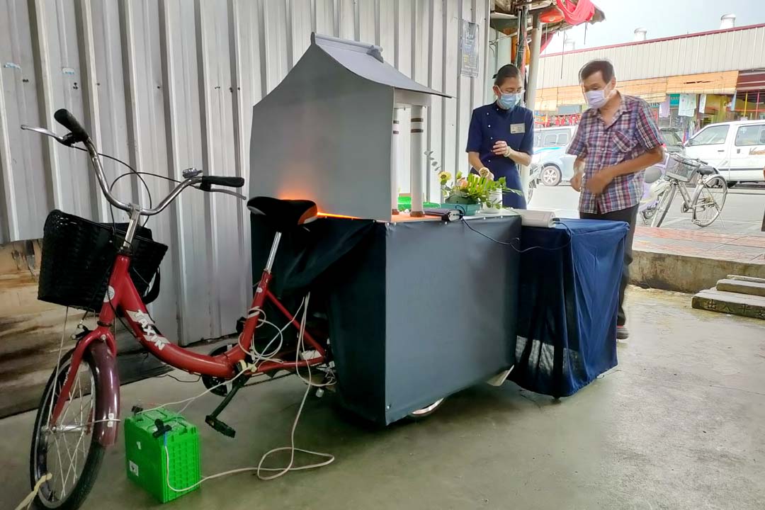 志工以一辆三轮车,布置成别具特色的流动浴佛台,车上有静思精舍的模型,吸引了不少人。协调志工胡美平(惟平)感恩方水茶室的老板娘李仕祯无私提供空间,让志工把浴佛台设立在人来人往的入口处;也希望透过这个小精舍模型,向民众介绍静思精舍的精神。