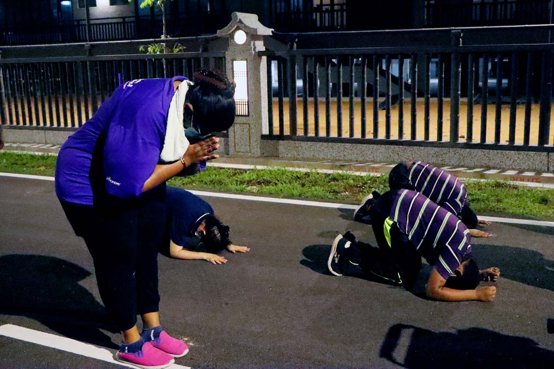 一开始,有人不熟悉,跟不上脚步,在工作人员的引导下,快速整队。有些人手都被沙子磨伤,膝盖也微微作痛,心却是清净明朗。队伍中也看见不少长者拄着拐杖、坐在轮椅;个个以虔诚精进的心来礼拜静思堂,一起跟着队伍虔诚一念心朝拜,一起“回家”。