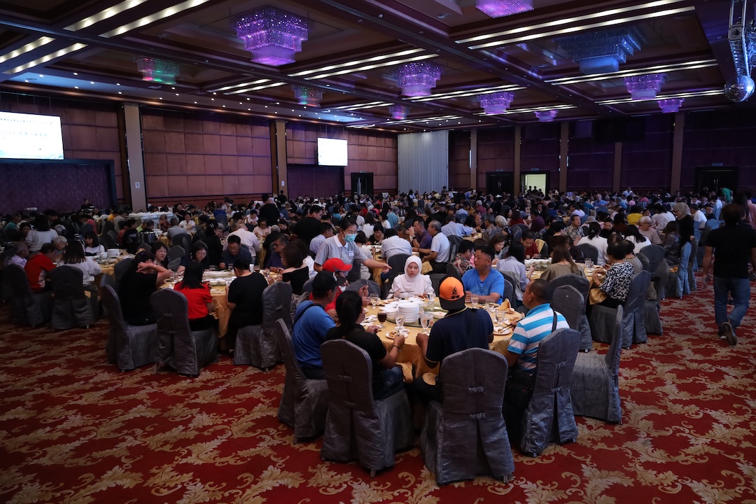 在每个志工的努力下,成功邀约了六十桌的会众约六百人,包括工作人员齐聚一堂,共襄盛举。有近九十高龄的老菩萨坐着轮椅来的,更多的是慈济人携家带眷出席来吃团圆饭。