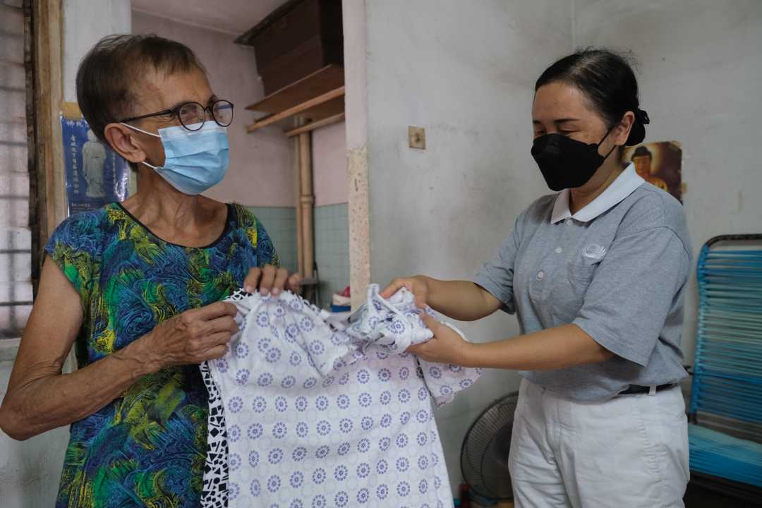 当时来家访的志工谢爱梅见吴婆婆孤苦无依,只靠政府福利金五百令吉过活,除了付还三百五十令吉的屋租,所剩无几。了解到吴婆婆住处的水管严重阻塞,冲凉、洗衣等需靠同座的租户帮忙提水;因水源问题无法煮食,吴婆婆每天会到素食馆打包经济饭,为了省钱,她往往只拿一两样菜,一盒饭也分两份,一份当午餐,剩下的就当晚餐。