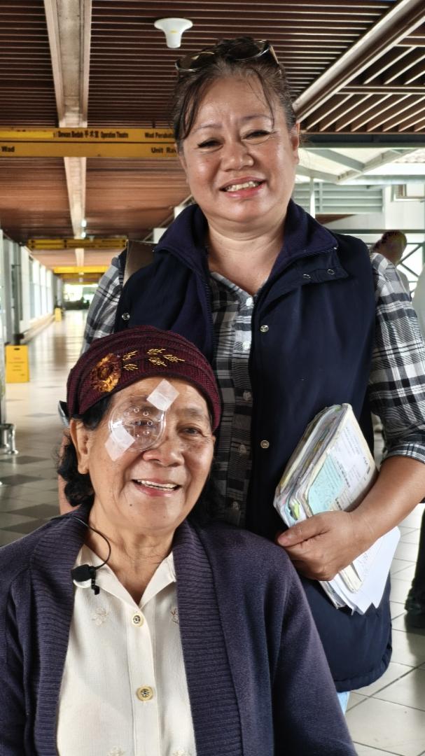 七十七岁的尤金阿秋近两年视力退化,行动困难。他与家人从林梦途经文莱前往美里接受手术,路途遥远却难掩喜悦。抵达后,医疗团队与志工细心安排、耐心说明,让他逐渐安心:“医生很好,大家服务也很好,让人很安心。”对阿秋而言,手术不只是重获视力,更是重新看见生活的开始。