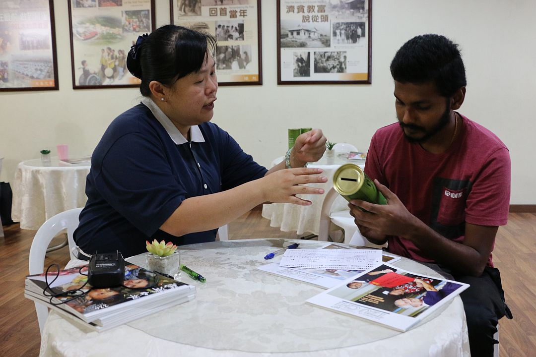 捐血后,志工为卡来亚拉山介绍慈济是个慈善团体,援助不同宗教种族的贫苦人,尤其给予淡米尔学校的清寒学生奖助学金,让他们完成学业,让他很感动。他得知慈济的竹筒岁月,是以小钱行大善,汇聚众人爱心的助人故事,他也领取一个竹筒扑满,希望可以和家人一起行善帮助他人。
