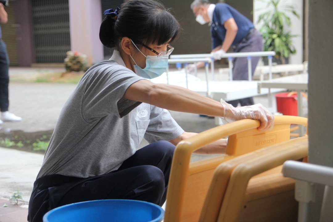 因被搁置在仓库的关系,载回来的病床得经过清洗和整理。社区志工在得知有此清洗病床的福田时,很快就圆满报名。 7月13日下午三时许,八位志工就聚集在圣淘沙共修处。同时,装满水的水桶、布块及水喉也待命着,人人都在期待付出的那一刻。