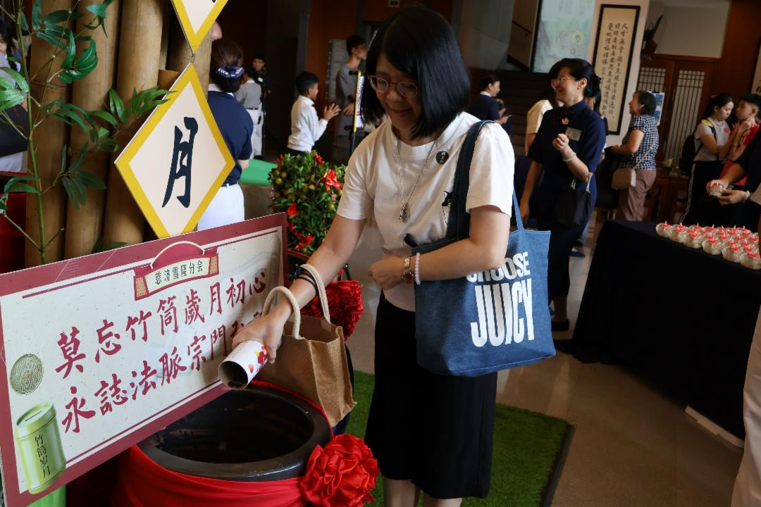 踏入人文厅,耳边随即传来“锵锵”的铜币声,那是会众将一年来“投竹筒”所累积的点滴善款倒入大瓮中。随后,会众还可参观“绿色行动体验展”与拍照打卡区,为岁末祝福留下片刻的记忆。