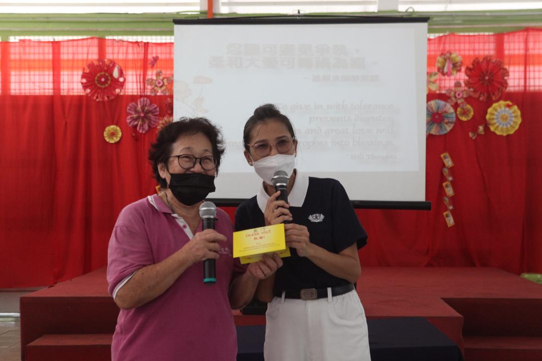 司柳仪丁翠(虑珏)获悉阿嬷们都有助人的心念,于是,也趁此机会让先前领取竹筒的阿嬷将竹筒内的钱交给志工,并送上阿嬷们之前捐款的收据。翠柳也借此感恩徐瑞芳阿嬷捐出三千令吉的善举,她将收据交给徐阿嬷时,也请徐阿嬷分享捐钱做善事的心得。