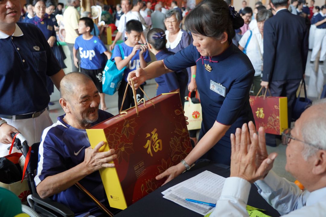 志工亲手送上礼盒,陪伴照顾户在新春感恩会中感受温暖。【摄影:陈培玲】
