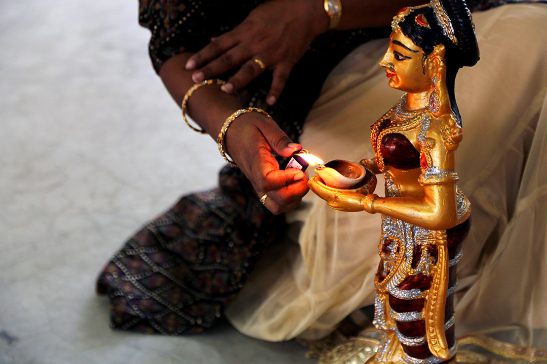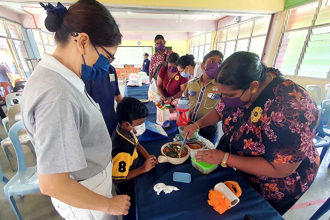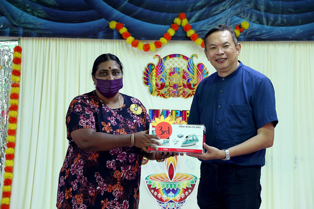 身处多元种族国家,需要学习相互尊重及包容彼此文化,其中真诚的态度最为重要。2023年11月5日,马六甲西区志工在亚罗牙也淡米尔小学(SJKT Alor Gajah)礼堂举办屠妖节感恩会,邀请社区共三十六户、逾百位印裔照顾户一起来同欢共庆。该校校长帕瓦蒂女士(Mrs Parvathy A/P Arumugam)和家协主席在志工和学校老师陪伴下,来到舞台前的彩米图,点燃两旁烛灯,象征“以光明驱走黑暗,以善良战胜邪恶”,祝福好运随着来。