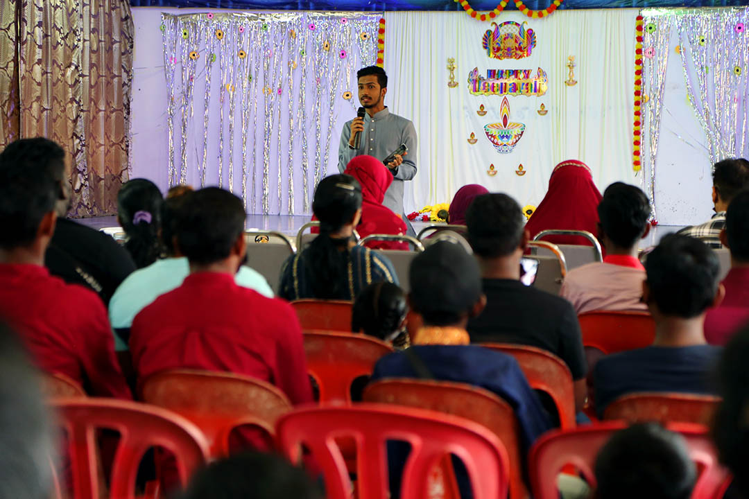 活动当天,照顾户和志工、校方代表和家协代表以外,华裔穆斯林协会(MACMA)四位成员也受邀与会。当天活动司仪除了志工,也邀来通晓华巫英印四语的年轻中学老师苏利亚(Suriyavarman A/L R.Ravindran)搭档。他说,两年前因癌往生的姑姑珊蒂(Santi A/P Ramudu)曾在志工陪伴下,度过人生最后八十五天,让在旁观察的他很感动。数年前参访慈济,他深刻体会一句话:“无论你为他人做了什么善事,善意都会以意想不到的方式降临到你的生活中;不管怎么样,就去做吧!”因此这回志工邀约,他二话不说贡献己力。