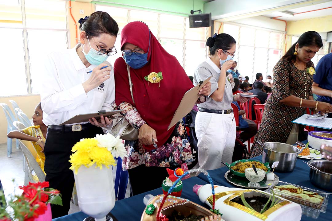 礼堂现场中央走道摆放长桌,让大人小孩置放所有参赛成品。在环保比赛中,孩子们必须发挥创意和想象,将不起眼、被丢弃的回收物制成花器。在烹饪比赛中,拿手糕点、饼干和佳肴则必须以蔬食为主。放眼望去,美食桌有杏仁花生巧克力饼、印度小食姆鲁古,还有咖喱、仁当,不同烹调方式的印度米饭等。