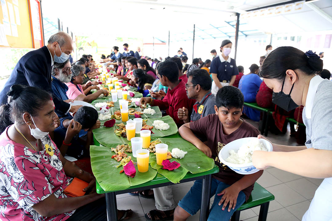 午餐时刻,志工亲自捧餐给照顾户和嘉宾们,现场还特别选用香蕉叶盛饭菜和水果,像印度宴会一样,仪式庄重。临结束前,每一户家庭都得到慈济送的佳节礼包,让他们有过年节的气氛。