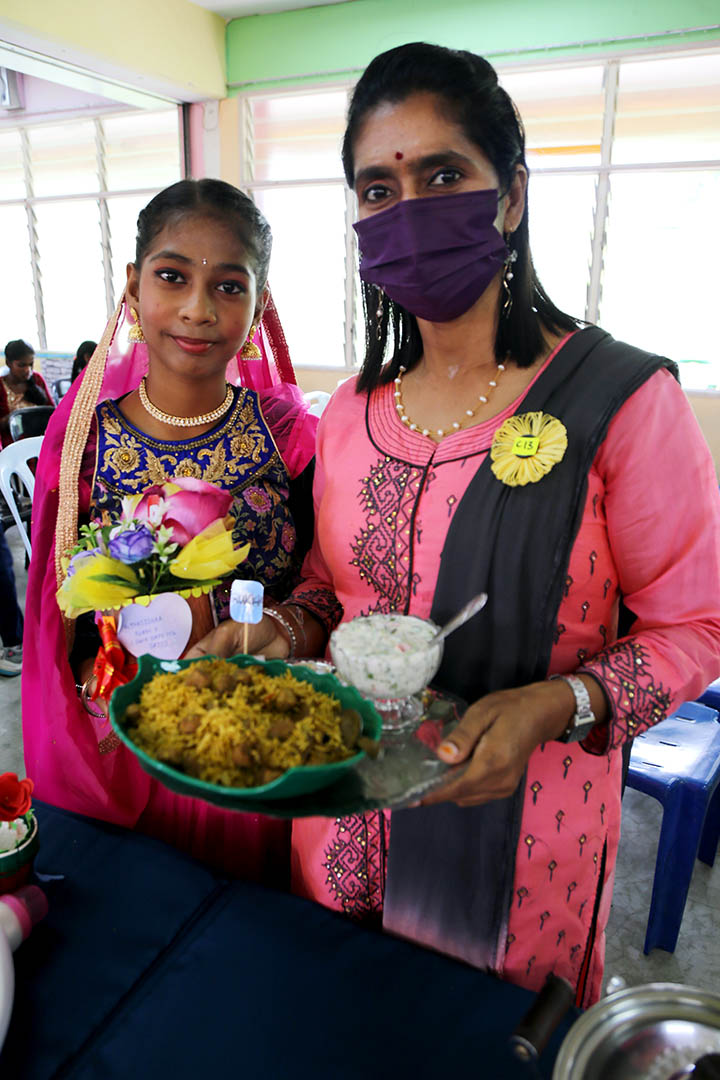 现场有两道不同口味的印度米饭,一道呈金黄色但不辣,另一道呈微褐色但微辣。这道微褐色的印度米饭是由特殊教育班老师侞古(Rukku A/P Muthutamby)准备。她说,这是很健康的食物,因为采用番茄、黑胡椒、芫荽、咖喱、黄姜、辣椒粉等香料,和素鸡丁一起烹煮,味道微辣,却可搭配一旁的酸奶和芫荽组成的饮料解辣。