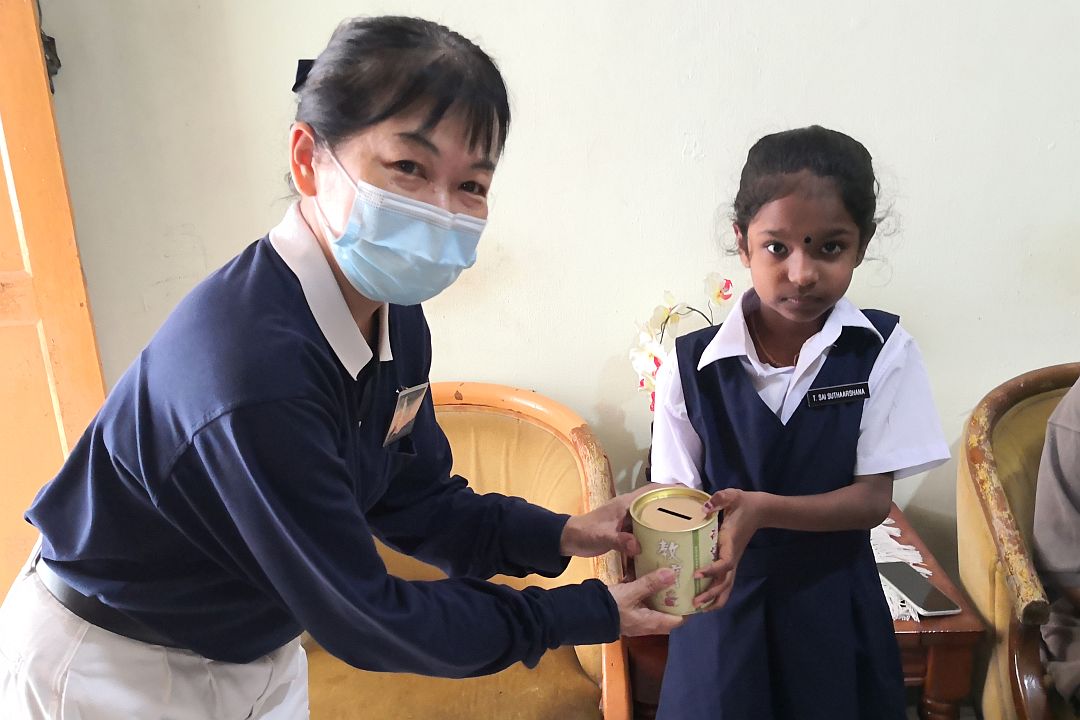 维拉沙米的孙女赛苏妲莎娜(Sai Suthaarshana)第一年获得慈济助学金的援助,因此,志工首次送上祝福礼包,让他们能欢度屠妖节。礼包里装了年饼、罐头、橙汁、食油等应节物资。这些过年不可或缺的年货,在疫情当下,蕴含着满满的祝福。赛苏妲莎娜拿出竹筒扑满交给志工去助人,表达善的回馈,这是她储存的零用钱。