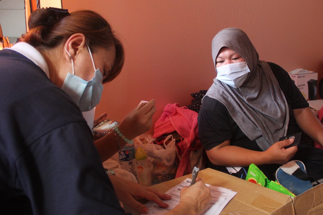 听闻慈济志工在现场派发奶粉,迪娜(Tina)即刻向志工申请所需物资。当她收到志工派发的奶粉后,如释重负的松了一口气,她感恩道:“奶粉可以减轻我的经济负担,目前孩子们非常需要奶粉。”她带着年幼的孩子暂住疏散中心。水灾时,因为匆忙,所带出来的随身物品不多,虽然中心有提供物资予灾民,然而非常缺乏奶粉的供应,疫情当下,他们也不能随意出外购物。