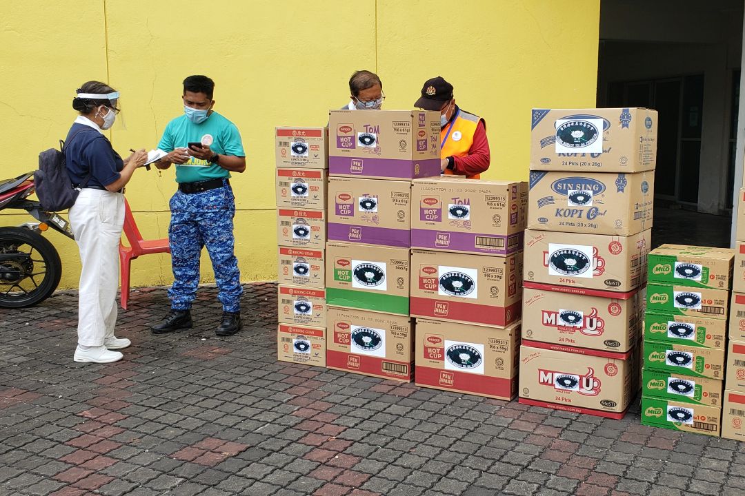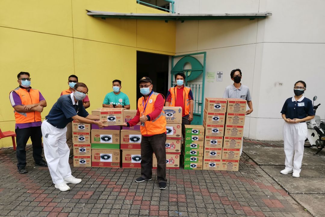 陈永顺代表慈济移交物资予隔离中心,由森美兰州福利部官员巴斯尔阿玛(Basir Amat)接领。