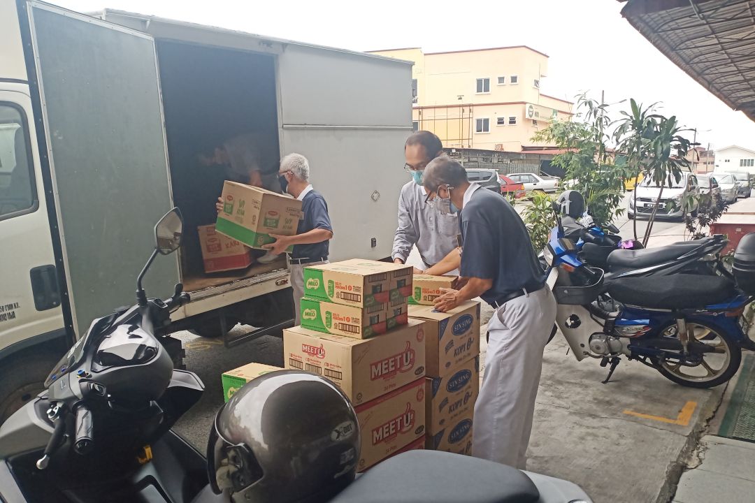 汝来室内体育馆低风险隔离及治疗中心,离慈济芙蓉会所约三十五公里,此趟远途发放属于跨县,必须申请通行证;过后五位志工分乘两部车载送物资前往隔离中心。