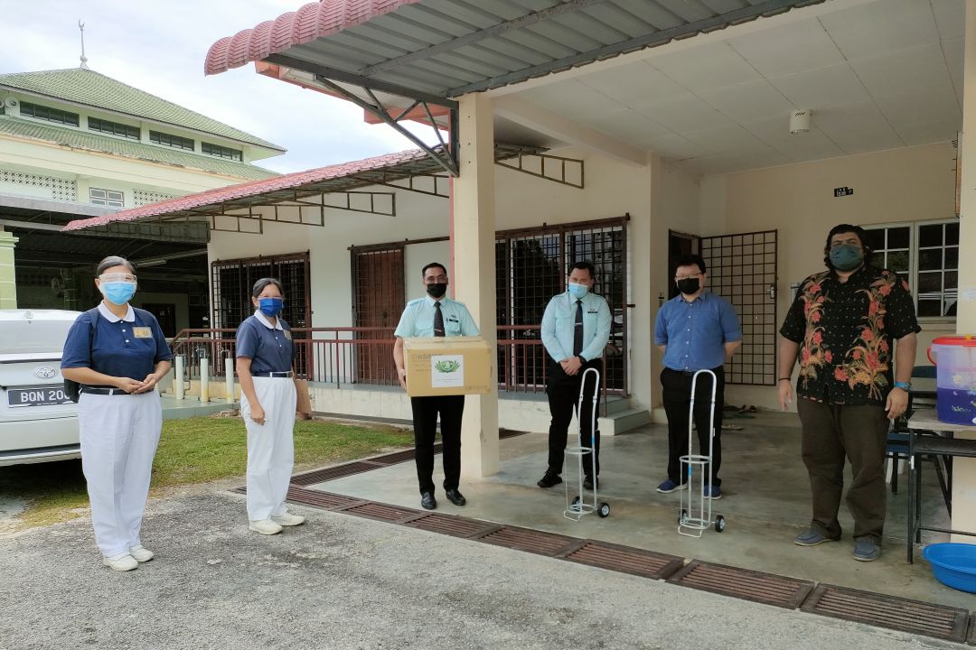 紧接着,志工们驱车前往波德申工艺学院隔离中心(Pusat Kuarantin dan Rawatan Covid-19 Berisiko Rendah 简称PKRC Politeknik Port Dickson)。慈济芙蓉联络处曾于6月11日发放物资及干粮予该隔离中心。此次则送上氧气头和调节器配备、氧气手推小车等。