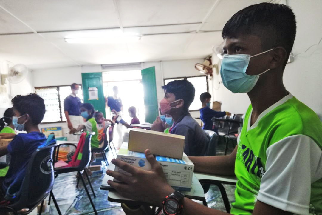 他说,父亲在外州工作,一个月才回来一次,他和叔叔一家人一起生活,很珍惜现在才有的读书机会。上课需要戴口罩,他看家里的口罩存量,来定夺一片口罩可以常常更换,还是连用两天,如果真的没有了,他会向同学提出需求。志工送上的口罩,他留给大人,小孩的口罩,则由他和弟妹们一起使用。