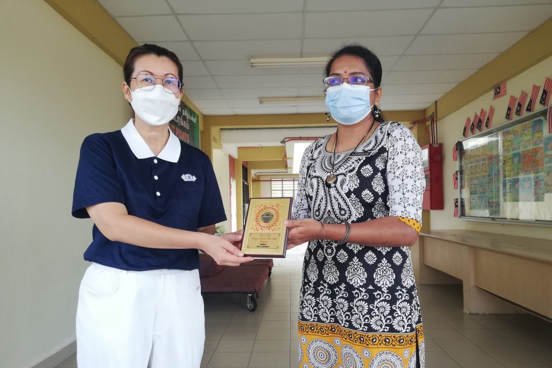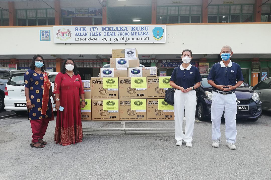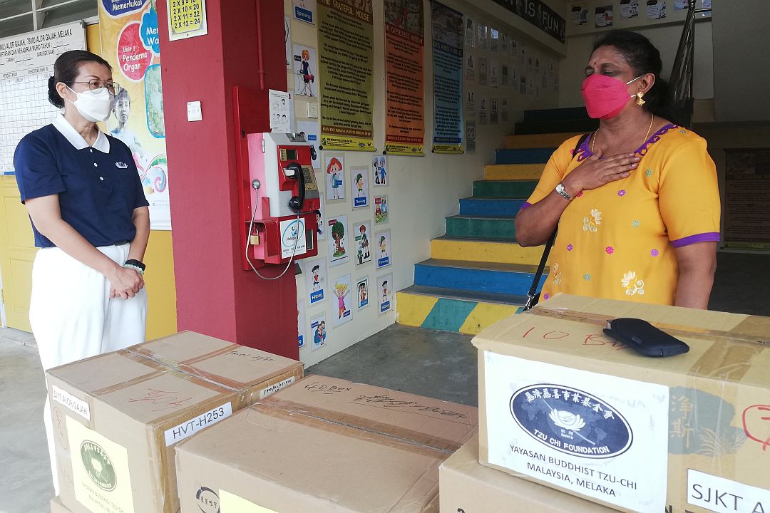 唯一坐落在市区的姑务淡小(SJKT Kubu),共有三百八十五位学生,科姬兰校长(Kogilam A/P Karuppiah),特别拨冗下来感谢志工捐赠十三箱口罩。她说,有孩子们天天使用重复清洗替换的布口罩,说话会比较辛苦,如今慈济提供的医用口罩非常理想,学生可以加强保护,也是来得及时、非常有需要的捐献。