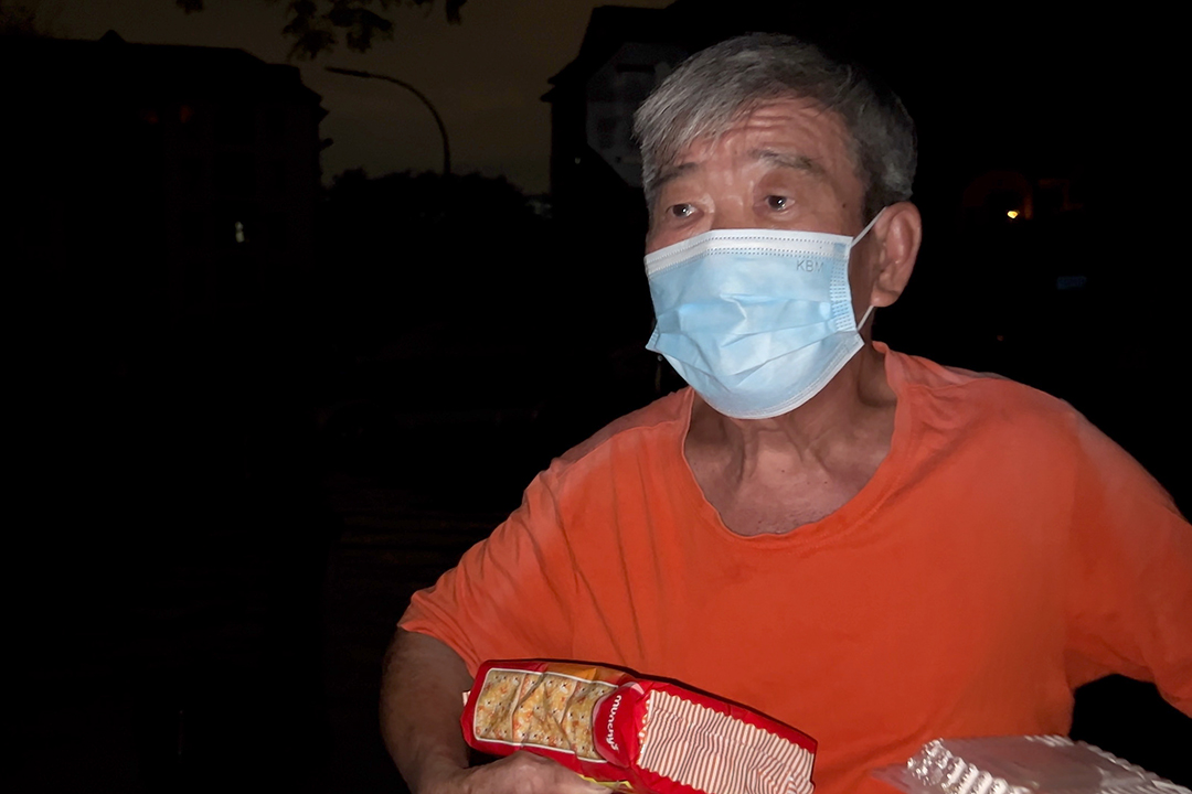军卡停驻在3M组屋一处,随行的军人协助呼叫组屋居民下楼领取物资。听闻物资援助的呼声,居民纷纷前来领取。有者要求饮用水、白米、蜡烛、食用油等。居民的声音,加上军人与志工的声音此起彼落,原本一片沉静的组屋区,顿时热闹起来。