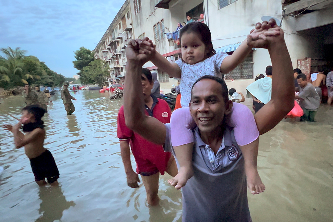 沙林(Salim)肩上扛着可爱的女儿涉水前来领取援助物资。他是一名技术员,居住于此二十年的他首次面对大水灾。他无奈地告知遭受到汽车与机车沉入水底的损失。但是,他深深感恩,并告知这裡的居民都很感谢各界人士在这艰难的时刻施予援助。