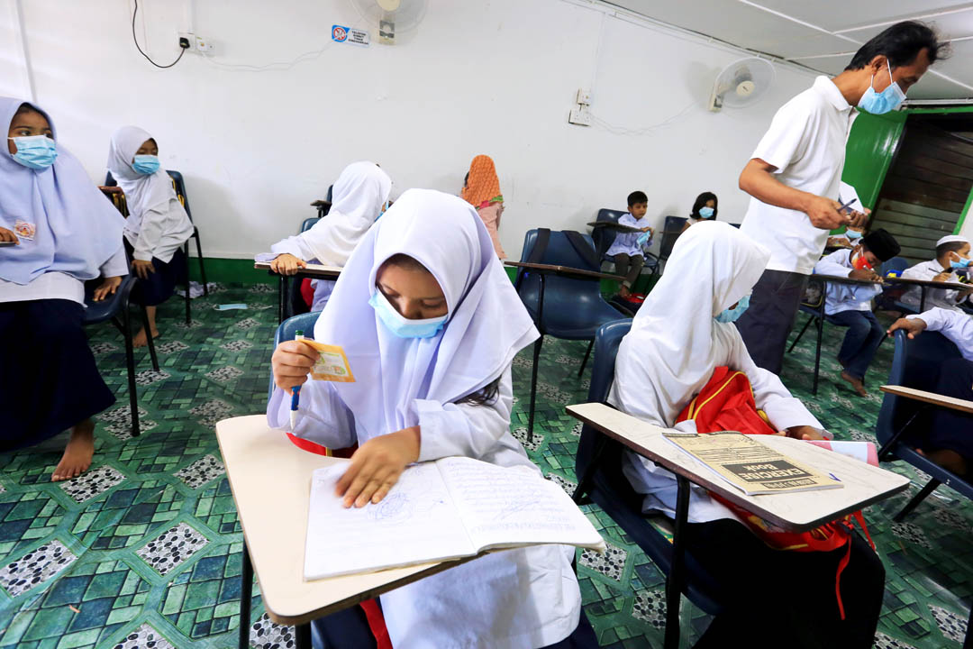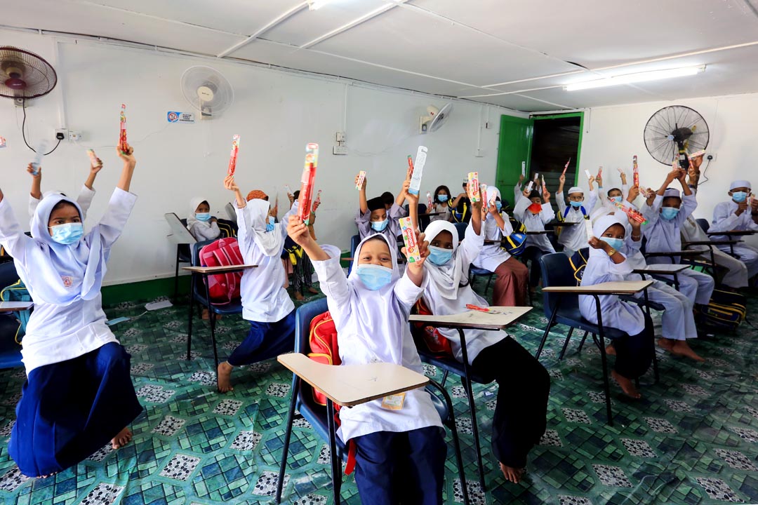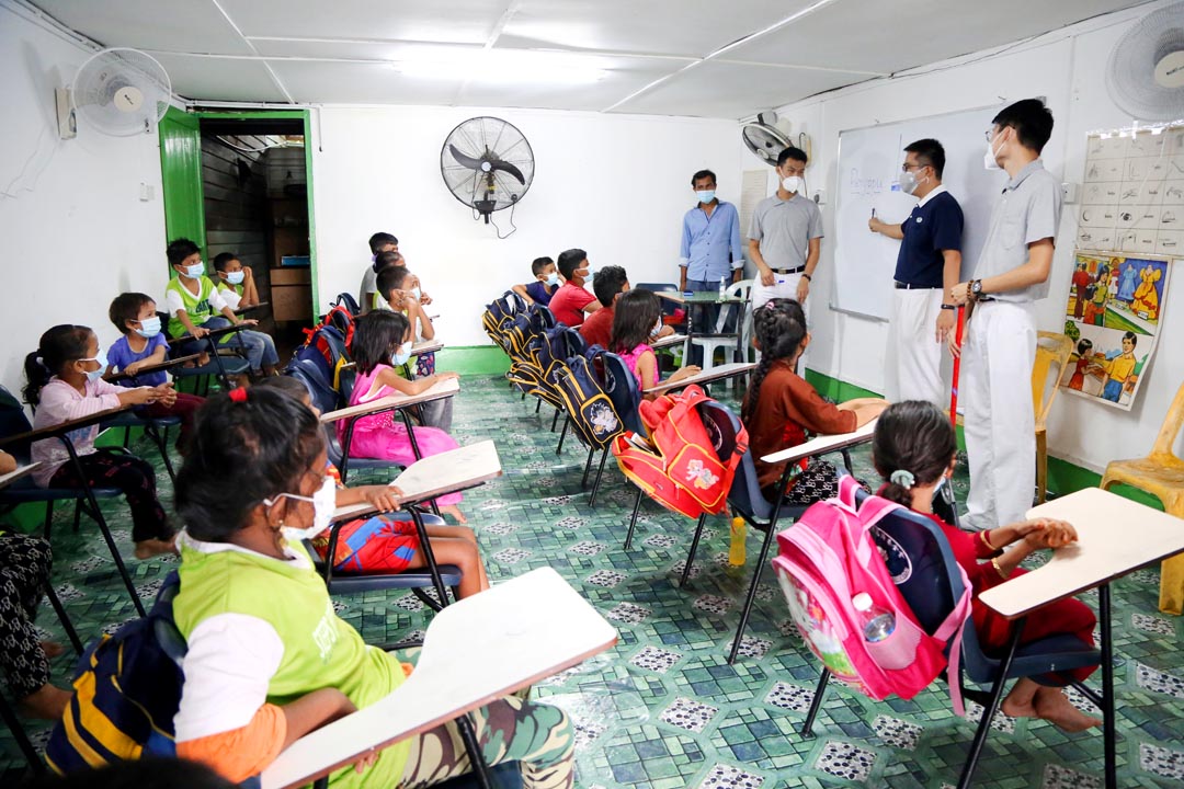 五岁到十三岁,二十二人不分年龄聚集一堂, 2022年1月开始从星期一至星期五在此难民教育学习中心念书学习。每天早上孩子们有宗教课,下午则由慈济马六甲分会聘请的老师莫哈末哈仑(Mohammed Harun Mohammed Islam)教导孩子们学科。原本连基本马来语、英文都不会,现在懂得从A写到Z ,以及简单对话沟通,礼貌上也有所进步。