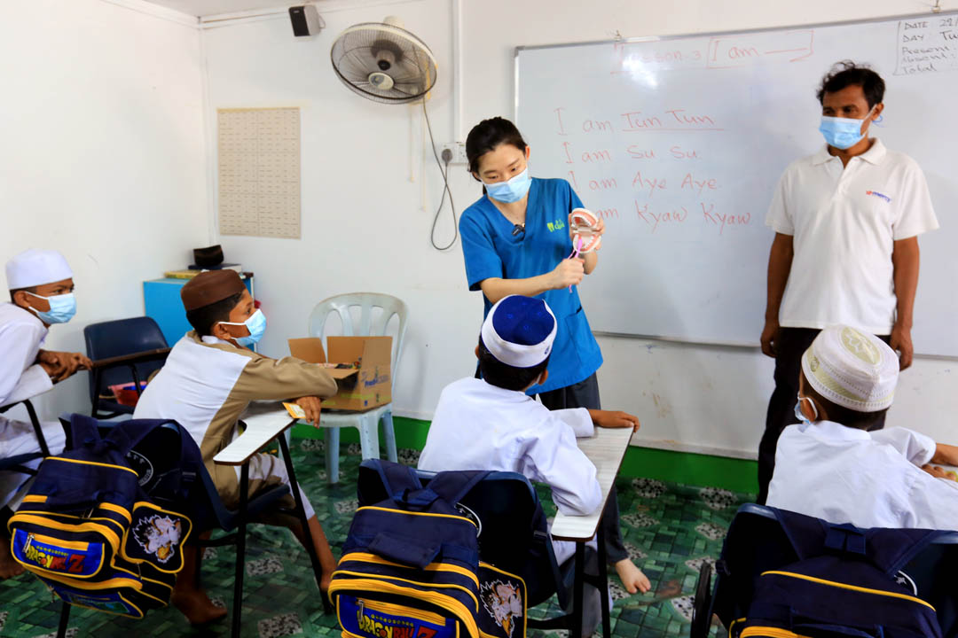 事后,吴美杰医师教导孩子们如何正确刷牙,以及叮咛培养日日两次、早上与晚上睡前刷牙的习惯。互动中志工发现,原来孩子们完全没有使用过牙刷和牙膏,莫哈末哈仑老师解释来自一些乡村的罗兴亚人生活方式是用手指当作牙刷,搭配当地一种粉状物为牙膏,这里孩子们也承袭大人的刷牙方式。