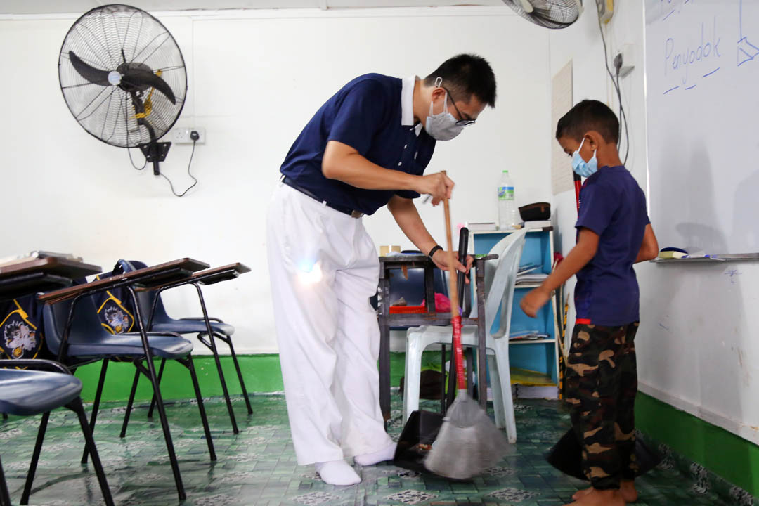 莫哈末阿亚斯听闻开心地回应:“我今天学到penyapu 、 mop 、 penyodok 、 baldi 。还有鞋子要鞋底与鞋底这样放整齐,以及朗朗地念着静思语'为自己找借口的人,永远不会进步'。”