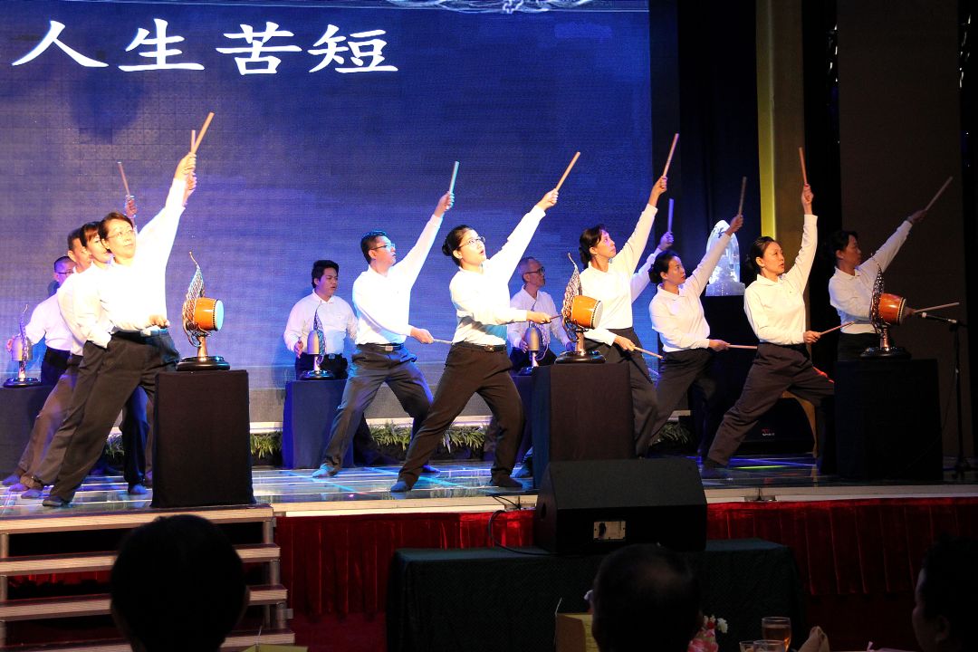 现场播放《药师如来十二大愿──终曲》,大荧幕显示着字幕,二十六位由志工曾银兰(慈雱)带领的鼓队,列队分东西班步上舞台,共同以虔诚一念心进行〈钟鼓齐鸣〉仪式,为宴会掀开序幕。