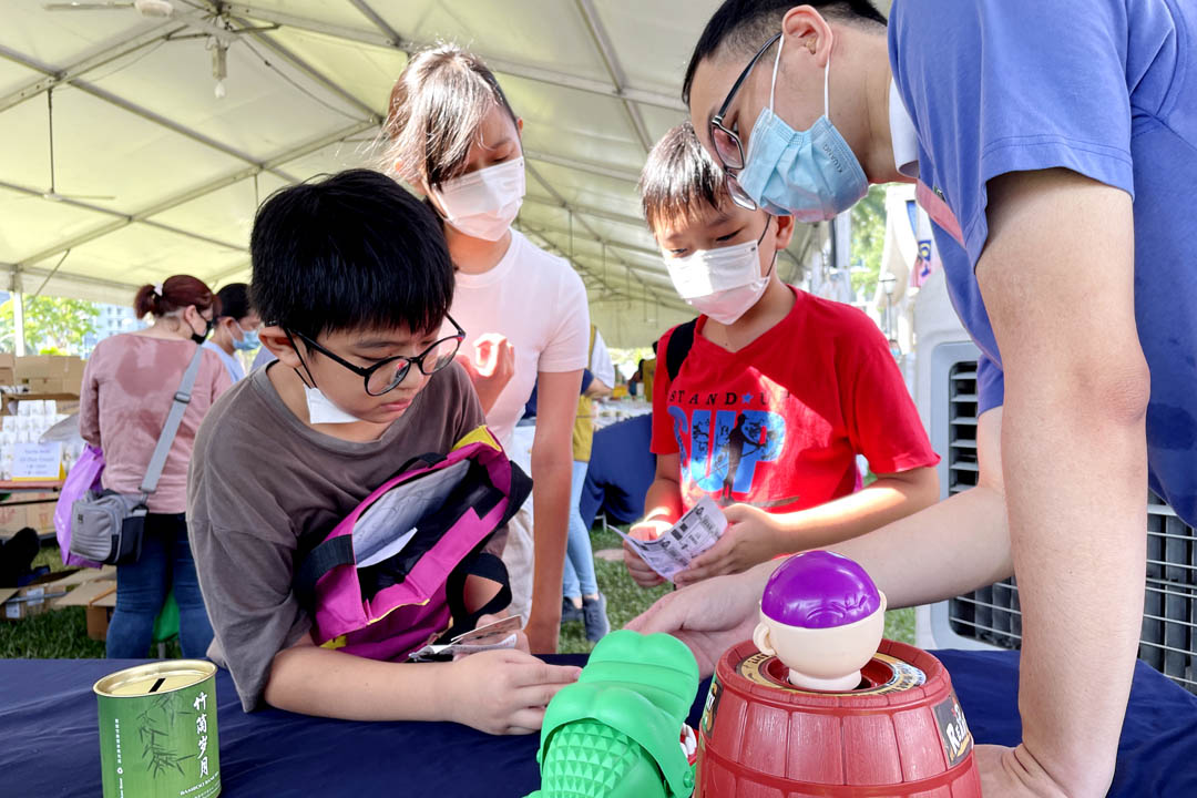 游戏区,就读四年级的邓学恒三姐弟玩得不亦乐乎,持续挑战三个游戏项目,一玩再玩,还与志工互动挑战游戏,最后赢得多样奖品。他兴奋地表示,义卖会有好吃又有好玩的游戏,今天玩得很开心!