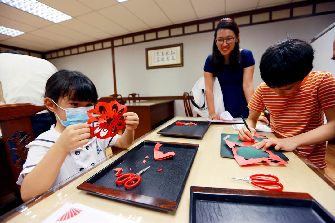 于园区一隅的社教课室,除了有学员成果展暨义卖外,现场还有体验课程。林秀凌的儿女及先生参与剪纸课程,六岁的女儿林青,年纪虽小,却很专注地剪出了漂亮的剪纸。
