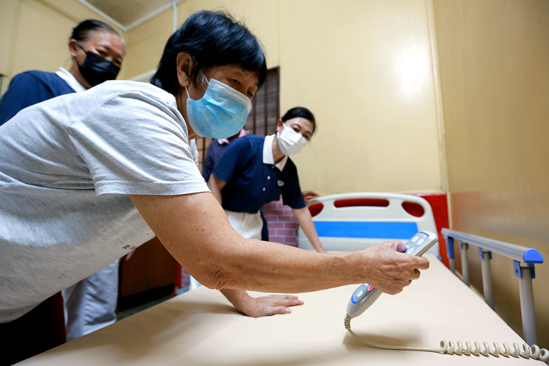 中午时分,护士和志工很快地取而复返,除了带来医生叮嘱的药物,更带来抽痰器,抽出体内不少痰液。此时医用病床也送到了,男众志工将病床安装好,女众志工则教导郑真金病床的操作方式,再合力将患者搬到新床去。