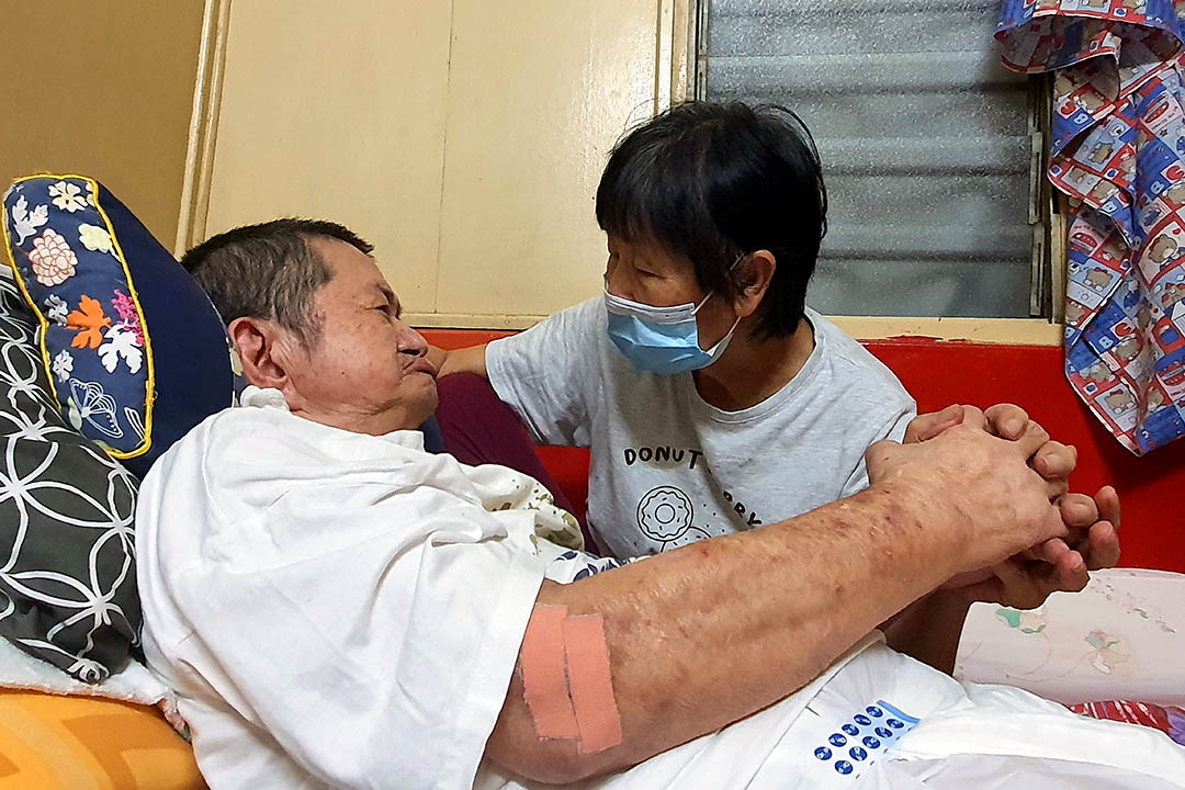 而社区志工对刘天赐的印象,是年前在妻子半支撑扶持下,颤抖着手脚,坐上轮椅到客厅看电视,或到户外晒太阳,说上一会儿话的模样;后来却只能长期卧床,说出单字或简单词语,来表达心中感受。
