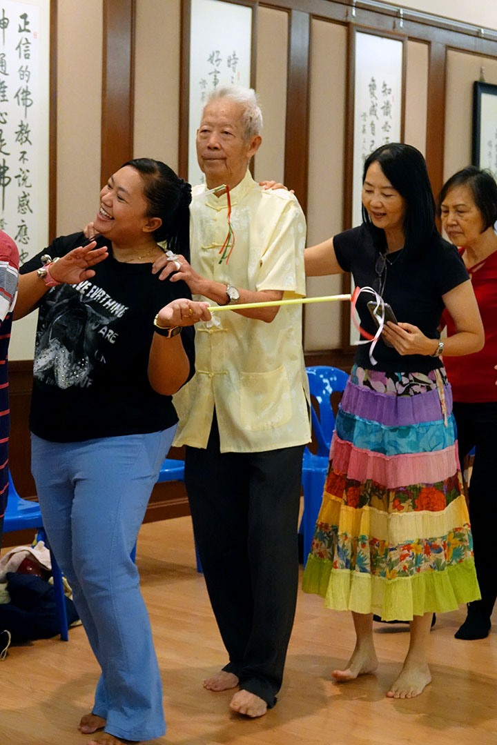 “我会吹口琴、笛子、唱歌,也打太极,这些都是年轻时跟朋友一起慢慢学的。”早年朋友常相约喝茶聊天,他也常在特殊节日作即兴表演。自从老伴离世后,他多半只在家里吹口琴给孙儿听;这次在女儿安排下再度施展才艺于人前,让他重拾往日光彩。