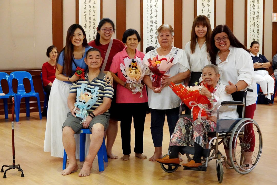 牵线让好友刘秀宝为父母报名长者学堂的高慧霖,今和阿姨各捧一束花,献给母亲与九十岁的外祖母,祝贺她们完成一年的课程。