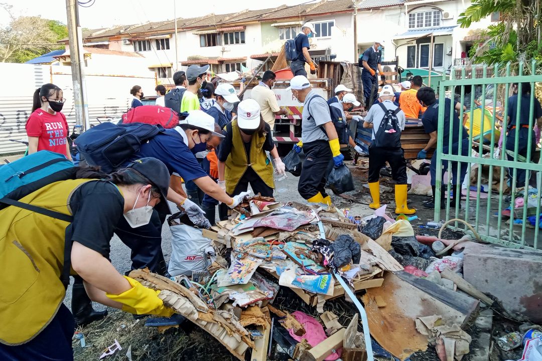 直至22日早上水退后,慈济即刻号召志工与会众参与灾区的清扫工作,获得热烈响应。 24日至26日,全马连心、北至南下的善心人士齐聚灾区,协助灾民整顿家园,希望安其身心。
