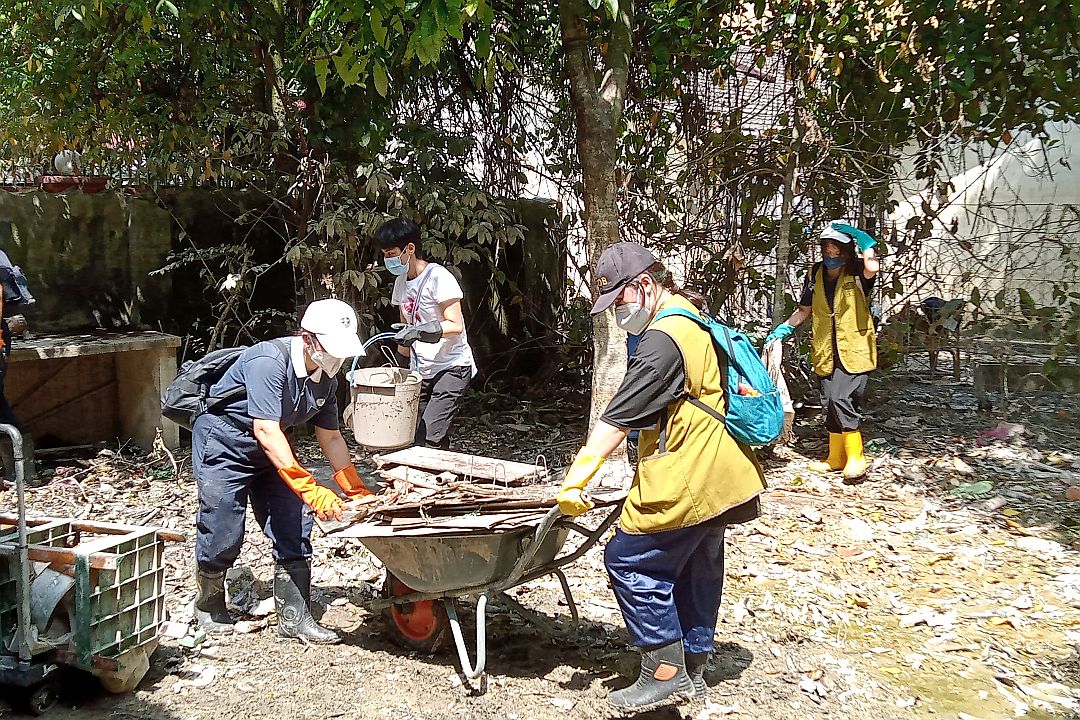 到达集合区,志工们带着工具,做好防疫措施、戴好口罩,换上水鞋、手套、帽子准备投入工作。