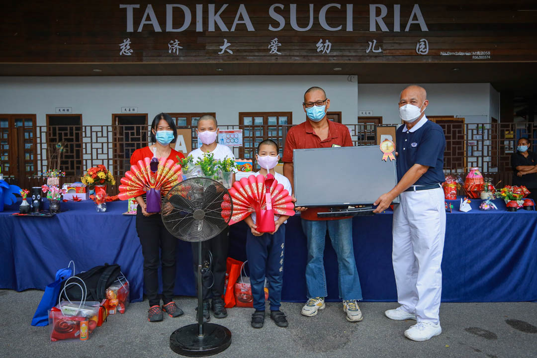 此次竞赛奖品全都是从慈济环保站收集而来,电器经过志工巧手维修,功能不减,这些别人眼中的二手物,却是弱势家庭渴望的礼物。紧张的颁奖时分,当志工公布第一名作品“孔雀开屏”林耀满雀跃地跑上台领奖,而林耀鸿的“鱼缸”作品获得第五名,赢取一台电扇奖励。