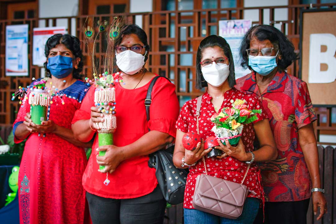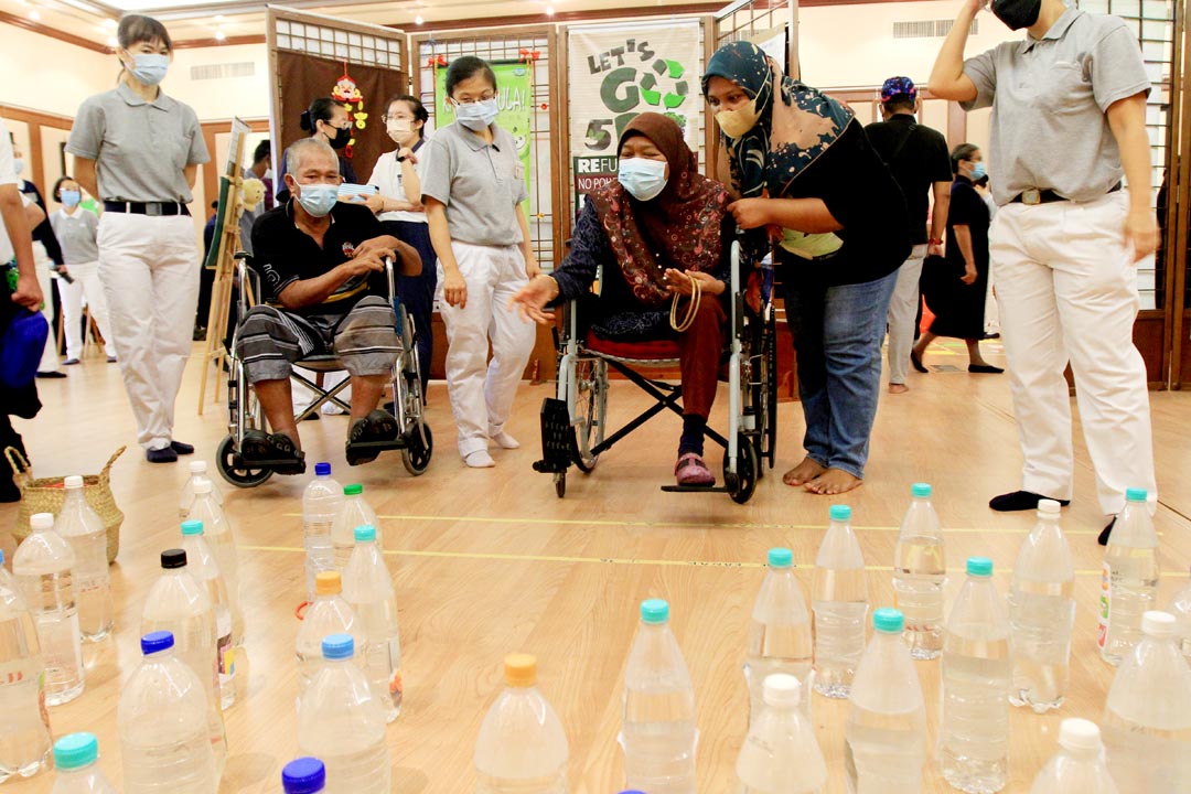 另一边化废为宝“环保手工竞赛区”,桌上摆满照顾户们的创意作品,如用红包袋制作新年吊饰,用塑胶瓶制作花盆,用纸盒制作实用小物等等。其中佳娜嘉玛( Ganagammal A/P Ramasamy)发挥巧思,裁剪宝特瓶,利用布料和衣服的毛线装饰品去点缀,再放入沙子与小植物,一个漂亮的桌型小盆栽就呈现在眼前。