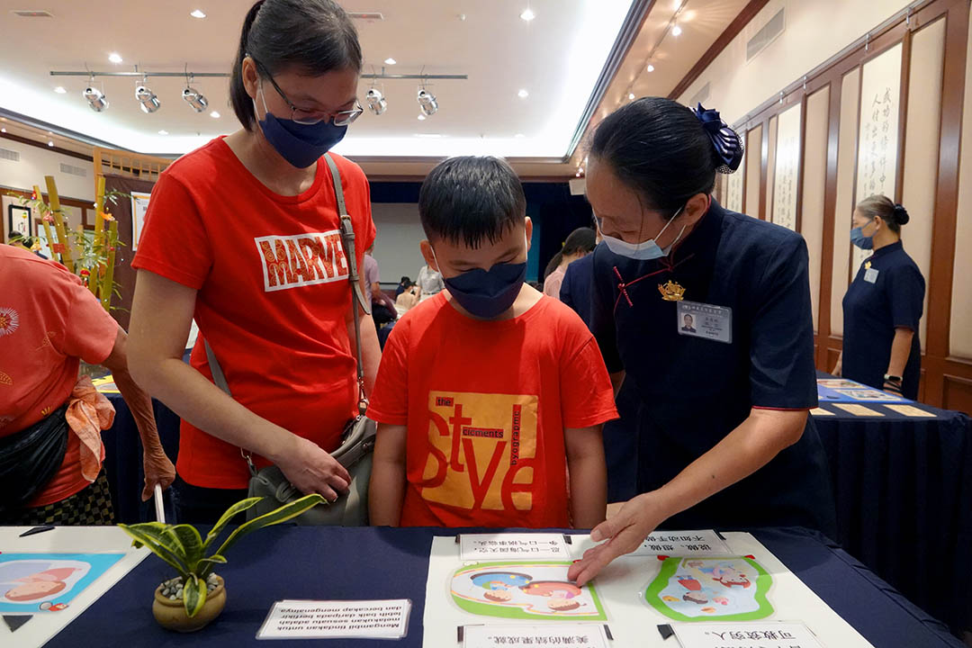 另一边中医针灸区,志工蔡玉婵(虑慕)陪伴照顾户、三十多岁的黄俊豪与其八岁的女儿前来诊断咨询。
