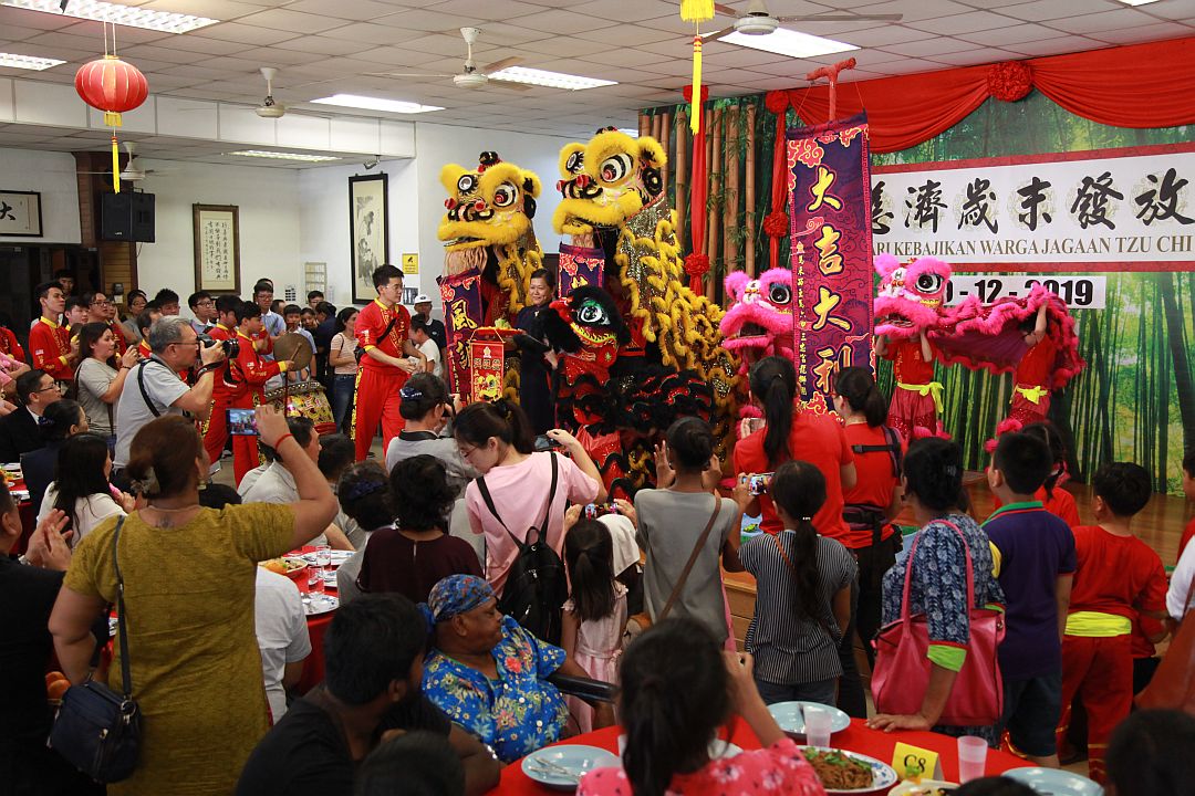 2019年12月29日,清晨时分,马六甲慈济园区充满年节气息,红咚咚的灯笼搭配着新年歌曲,义剪、义诊、挥春、环保闯关游戏、惜福区等也陆续登场。厨房里志工们忙着洗菜、切菜、烹煮,炉火的火焰更增添暖意。入口处,志工们则开心地列队迎接每一位贵客上门。不管是携家带眷,或是志工载送陪伴而来,也不管是年迈的长者,坐轮椅行动不便者,或是有装着廔管的洗肾病患,大家克服身体上的不适与不便,把握一年一度的相聚。