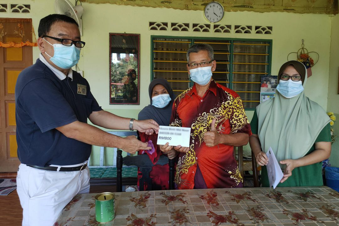 7月15日志工送上纾困金,莫哈末努尔郑重穿上马来传统服装峇迪(Batik),隆重地迎接志工到来。戴金龙代念证严上人慰问信,送上马币八百令吉纾困金,莫哈末努尔感动地说:“以前女儿生病时,慈济帮助。没想到疫情生活艰难时刻,再度收到慈济的援助。”当下,他掏出马币十令吉捐款,并向志工表示,他要延续爱心,定期捐款。