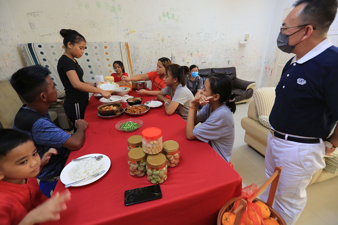 除夕当天傍晚,志工李秋忆(慈铤)准备了几道年菜,黄芃凯(惟相)则带来盆菜,为陈成文一家加菜。陈成文满脸笑意,毕竟这样丰富的除夕佳肴,只是多年前在家乡的回忆而已。