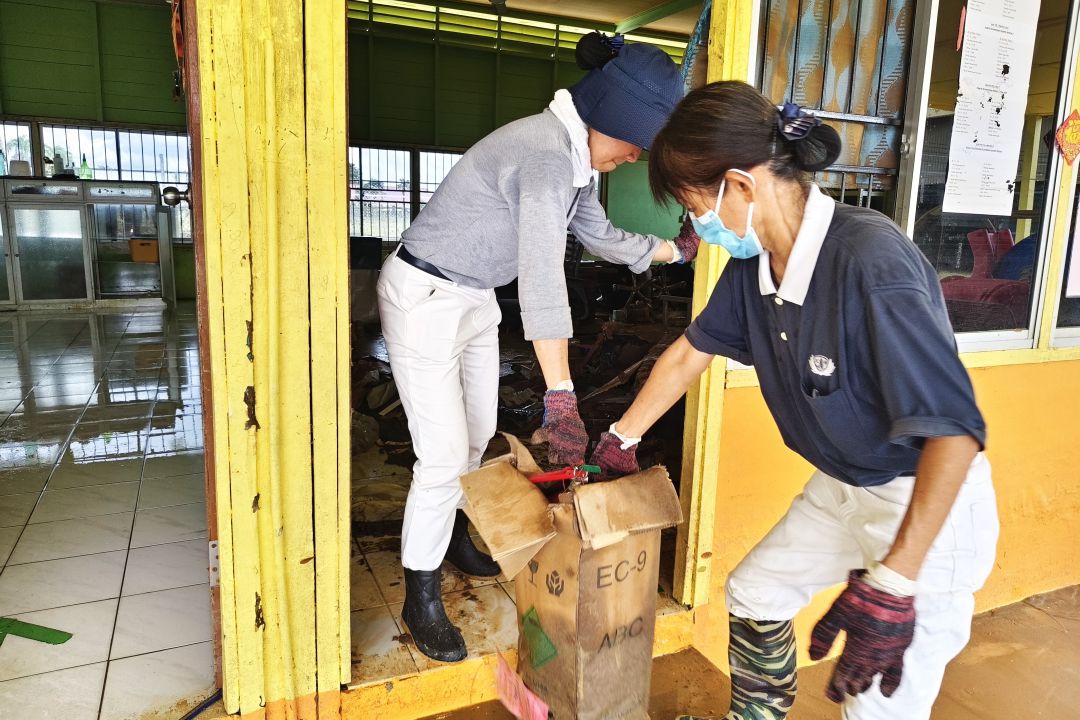 于此同时,获知实务地中华学校(SJK (C) Chung Hua Sibuti)及隔邻的的幼儿园遭洪灾重度破坏,校内大量设施,如:橱柜、钢琴和各类教学器材皆被洪水浸毁,志工于2月4日前往勘察,并加入清理校园的工作。