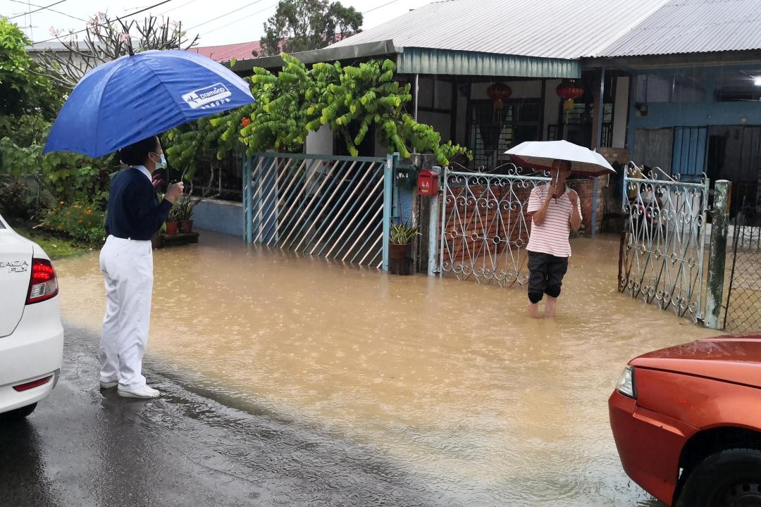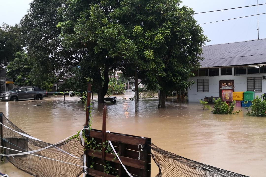 一场长命雨,造成居銮多处水灾,位于业陶沙区的Jln.Resak和Jln. Jelutong由于处在大河旁,早已沦为水乡。下午时分,该区淹水已有半公尺。【摄影:刘宝聆】